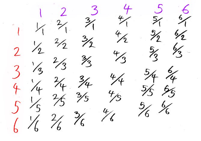 Now what if we consider rational numbers? All the possible fractions you can make? Surely there are more of those than there are positive integers. But again, there is a way to match them up 1-to-1 in another of those bijections.